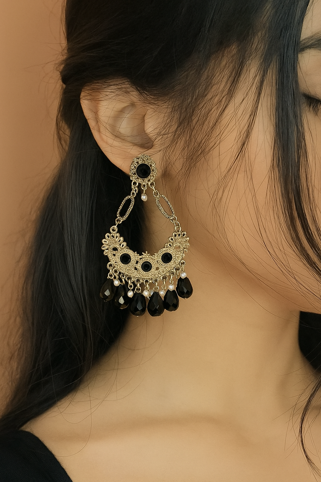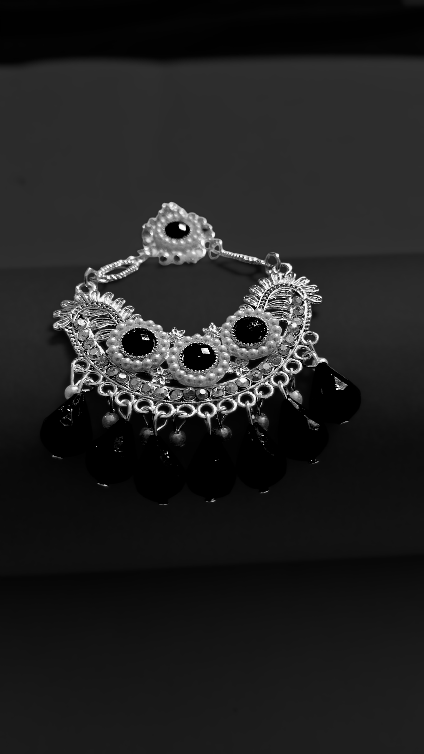 The crescent-shaped design is adorned with black teardrop beads and dainty pearls, giving it a regal charm that’s perfect for weddings, festive occasions, or evening parties.