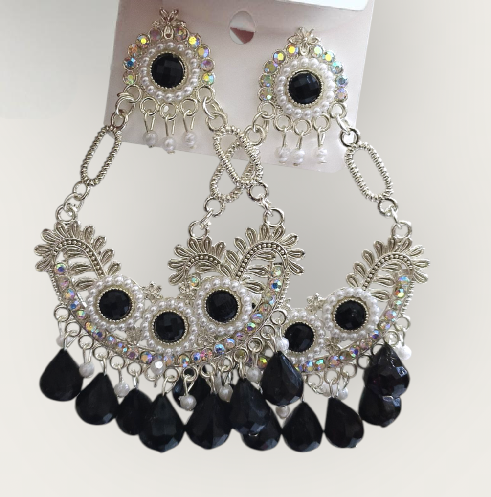 Add a touch of sophistication to your look with these stunning handcrafted statement earrings. Designed with intricate golden filigree work, these earrings feature bold black stones at the center, surrounded by delicate pearl accents and shimmering crystals that create a dazzling effect.